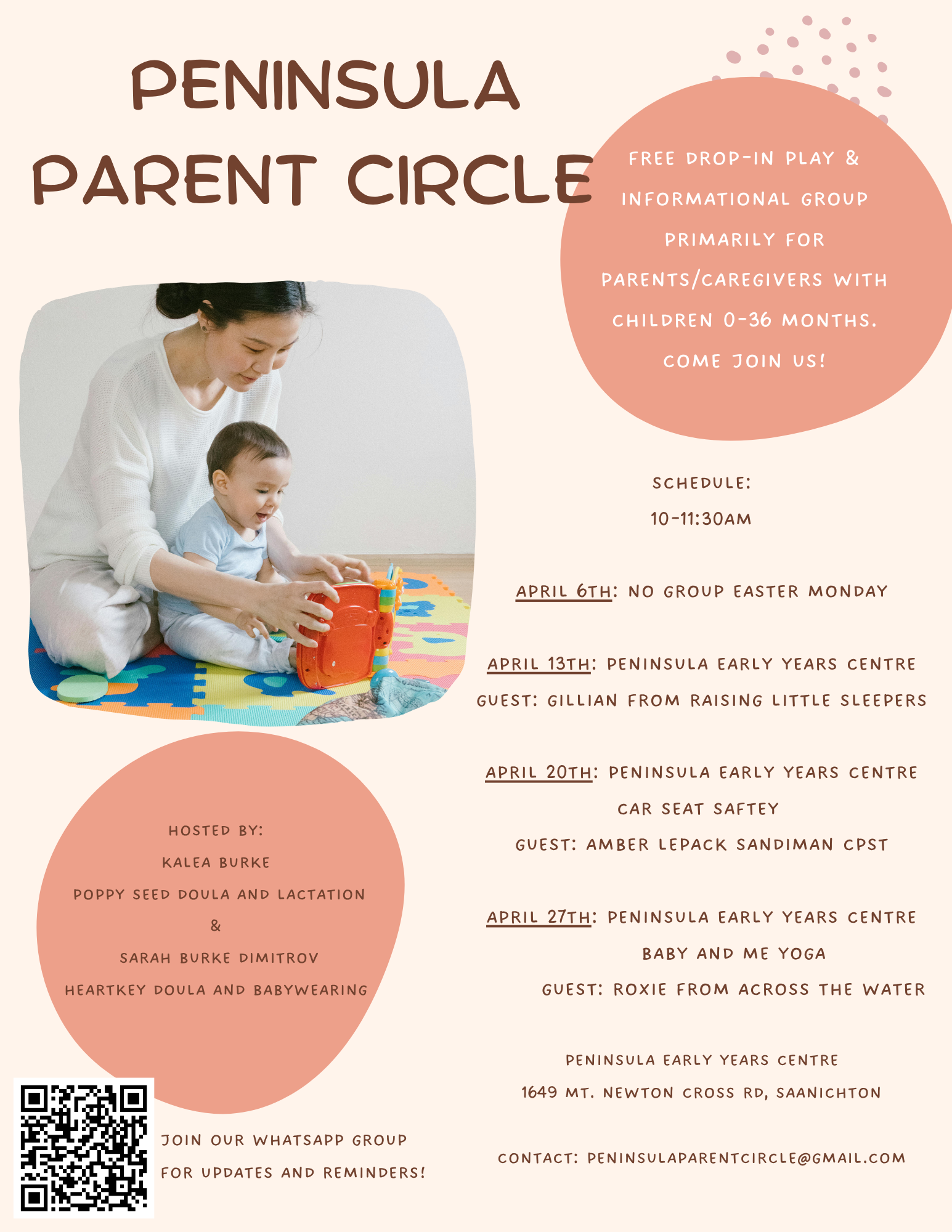 Come join our Tuesday play group! Co-run by myself and Sarah, we strive to provide informational sessions, walks around the community and play time. Ideal for children 0-36 months. Please check the flyer for dates, time and location. We hope to see you there!